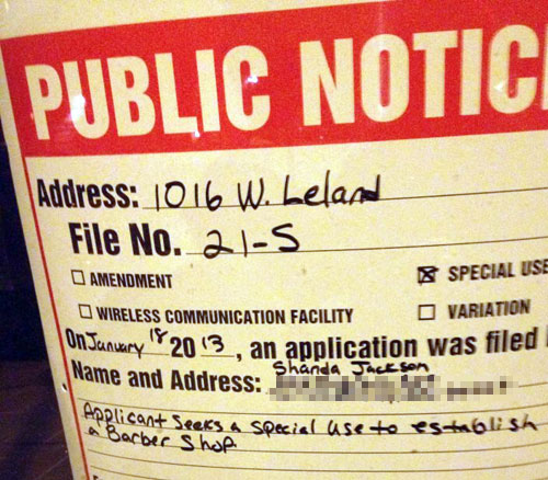Allegedly, the 46th Ward Master Plan done by the Alderman's office said 'No more barbershops in this area.' Not sure if that's true, but some nearby residents have been having some unsettling feeling about this as the previous barbershop apparently attracted a lot of loitering and litter outside."